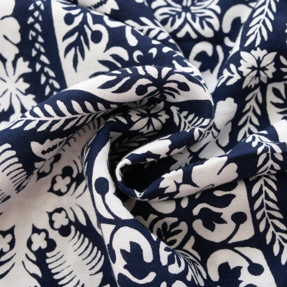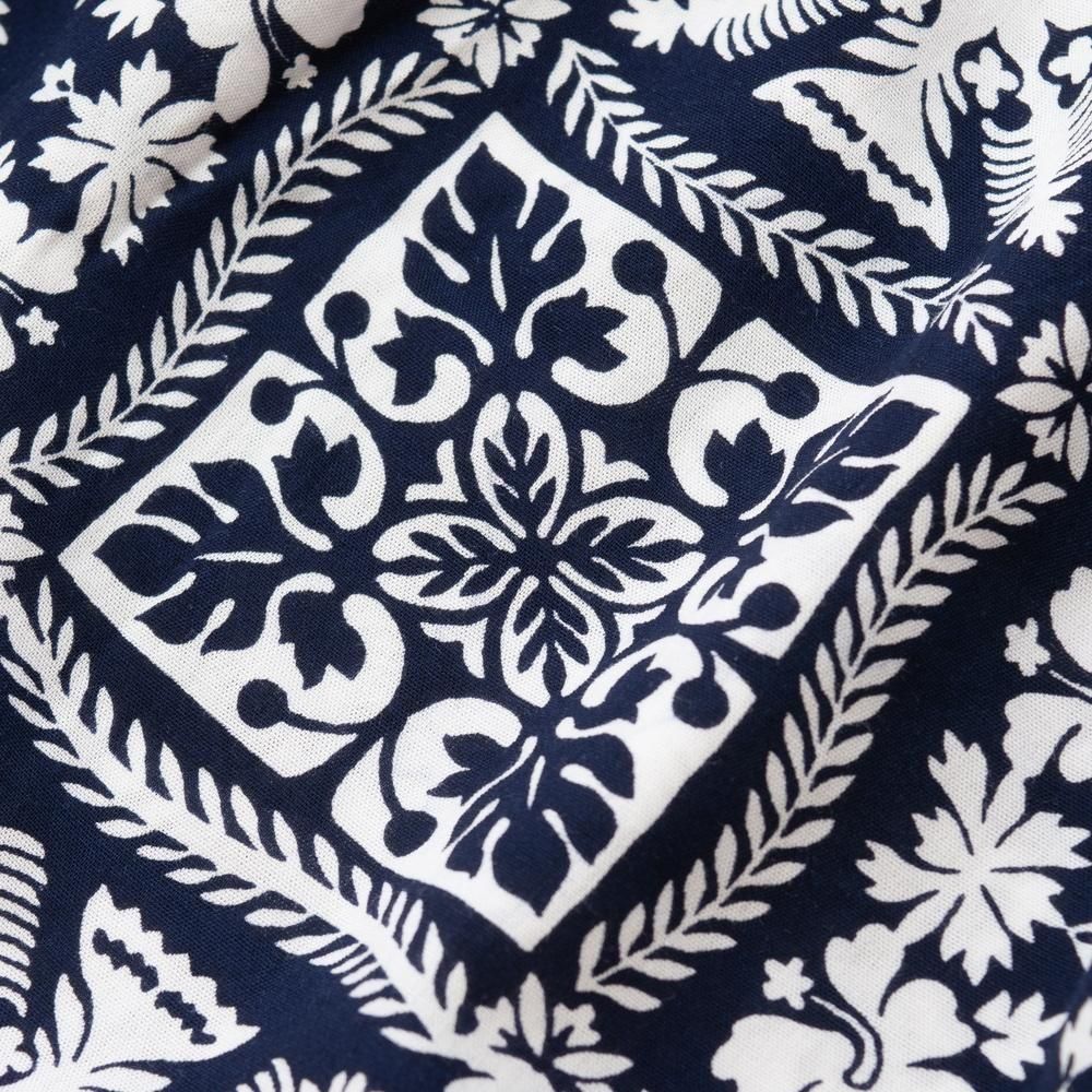 落ち着いたネイビーベースに、白のリゾート柄が爽やかに映える一枚。