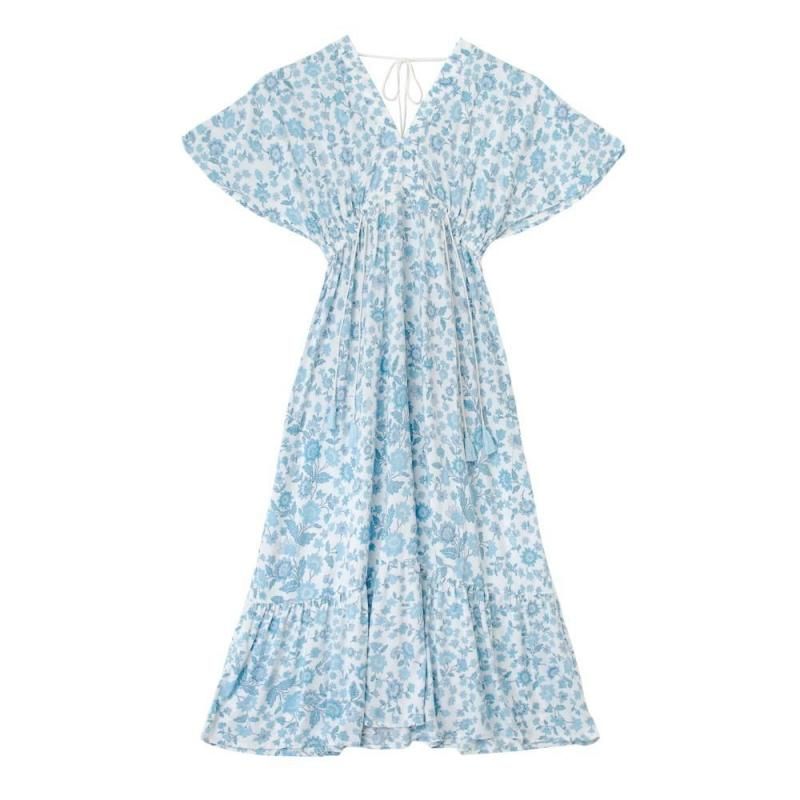 真夏のリゾートシーンに映える、ブルー花柄のロングワンピース。