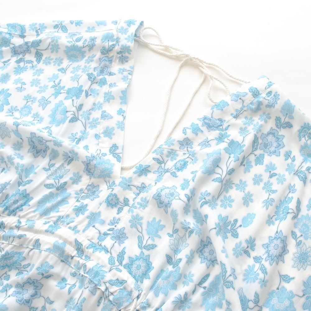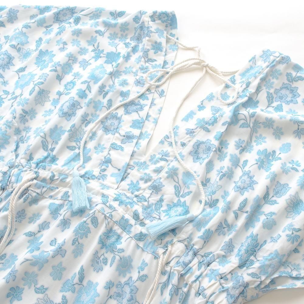 清涼感あふれるホワイト地に繊細なブルーフラワーを散りばめ、リゾートならではの開放感を演出します。
