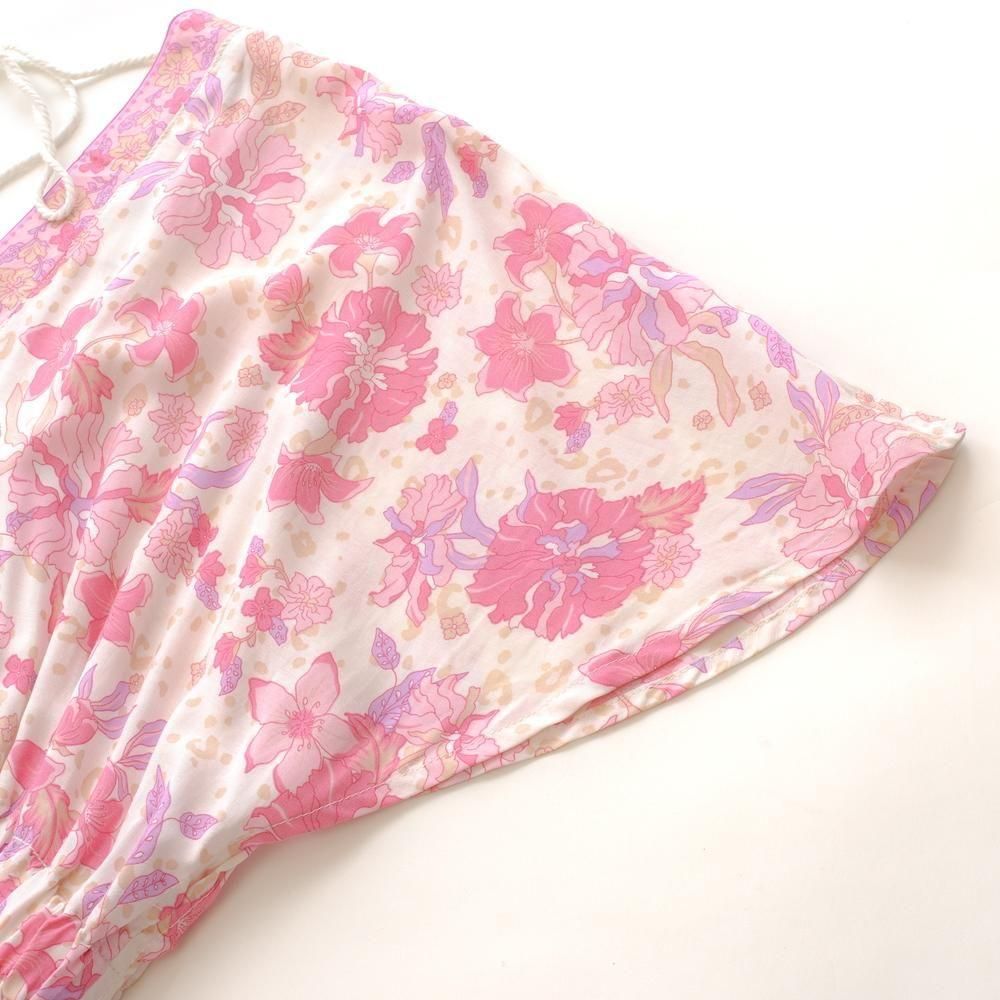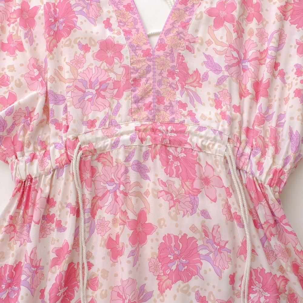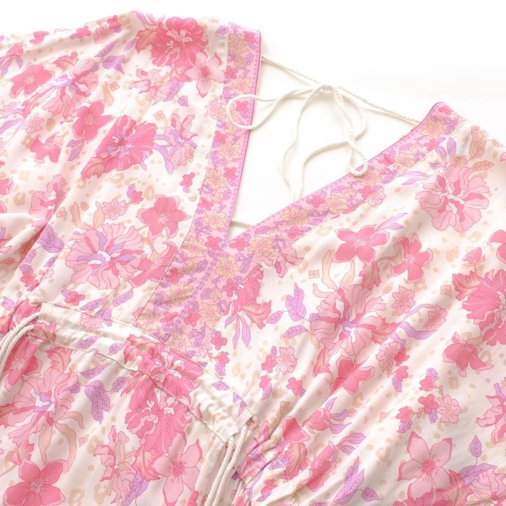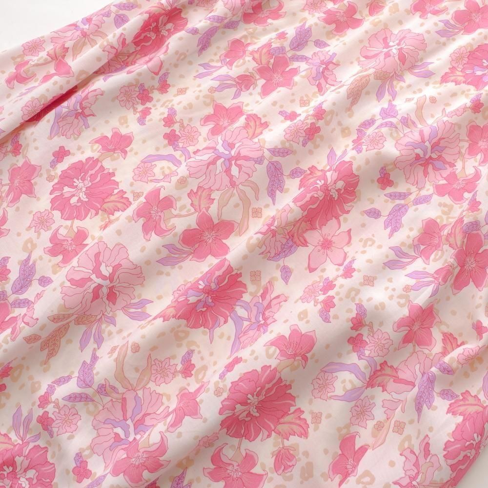 優しいホワイト地に鮮やかなピンクの花柄が広がる、華やかさと可愛らしさを兼ね備えたロングワンピース。