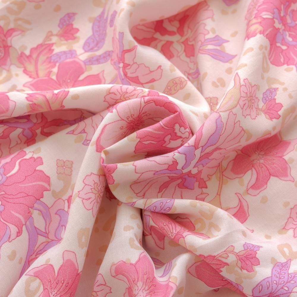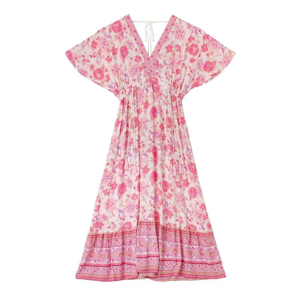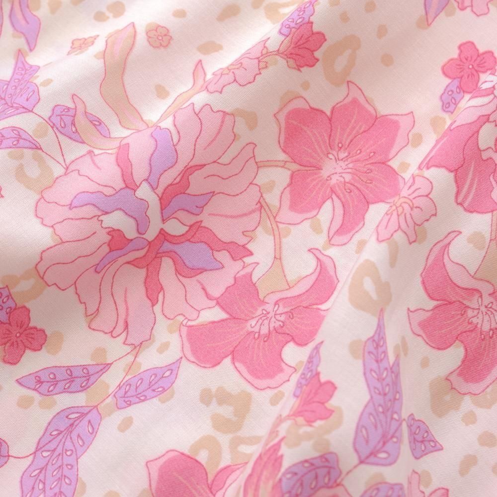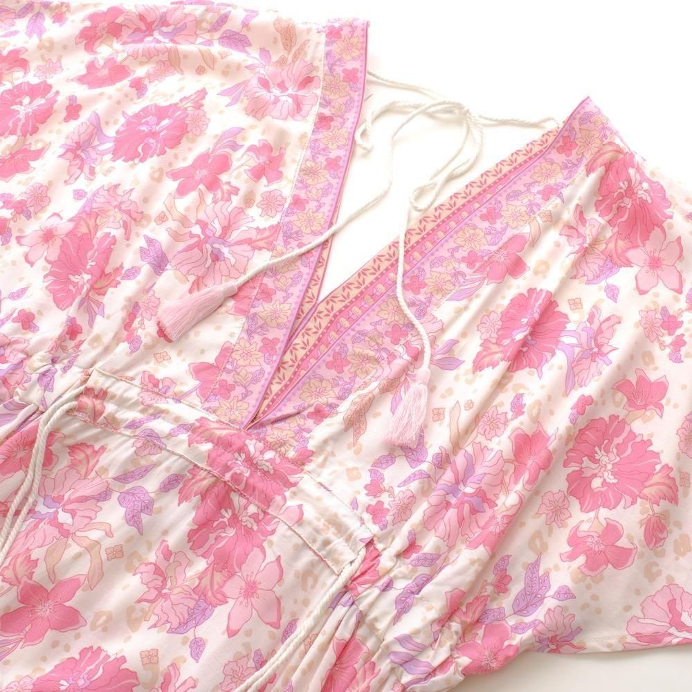 優しいホワイト地に鮮やかなピンクの花柄が広がる、華やかさと可愛らしさを兼ね備えたロングワンピース。