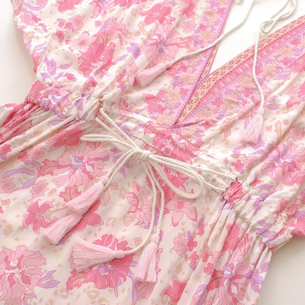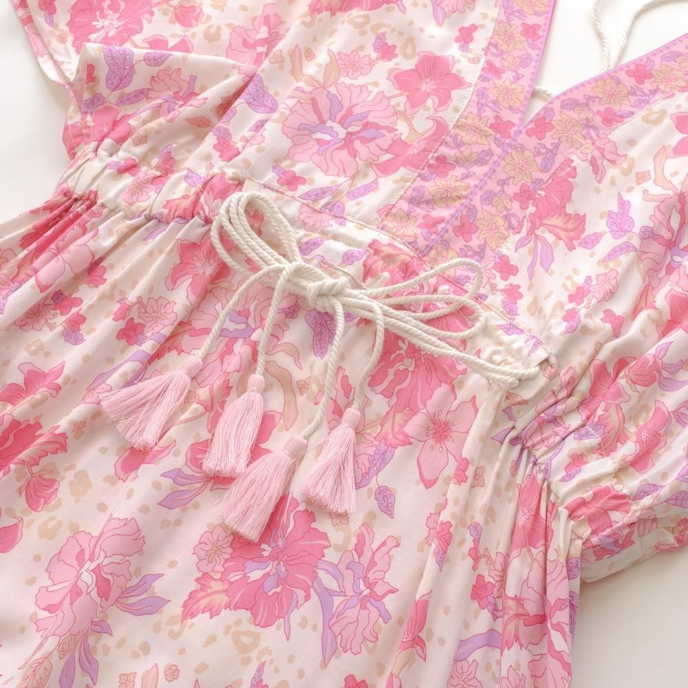 胸元の切り替えからゆったり広がるシルエットとタッセルの揺れが軽やかで、夏のリゾートシーンはもちろん、街中でのお出かけにもぴったりです。